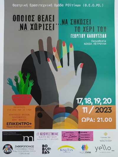 Έπειτα από τον πρώτο κύκλο επιτυχημένων παραστάσεων που πραγματοποιήθηκαν τον περασμένο Ιανουάριο, η Θεατρική Ερασιτεχνική Ομάδα ΡΟϊτίκων (Θ.Ε.Ο.ΡΟ.) παρουσιάζει εκ νέου το γνωστό θεατρικό έργο του Γιώργου Καπουτζίδη «Όποιος θέλει να χωρίσει…να σηκώσει το χέρι του» σε σκηνοθεσία της θεατρολόγου Νικόλ Πετρουλή.