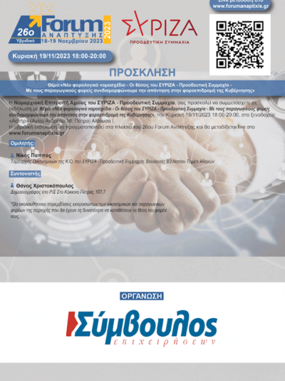 Η Νομαρχιακή Επιτροπή Αχαΐας του ΣΥΡΙΖΑ –Προοδευτική Συμμαχία διοργανώνει εκδήλωση – συζήτηση στο πλαίσιο του 26ου FORUM Ανάπτυξης 2023 την Κυριακή 19 Νοεμβρίου 2023 και ώρα 18:00 με θέμα: