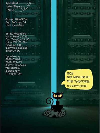 Θα παρουσιάσει το έργο του Samy Fayad με τίτλο «ΠΟ$ Ν@ ΛΗ$Τ3Ψ3Τ3 ΜΙ@ Τρ@Π3Ζ@» στις 28, 29 Νοεμβρίου και 1-5 Δεκεμβρίου 2023