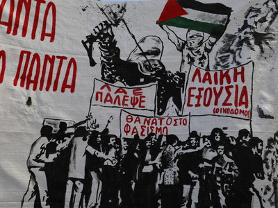 Νωρίτερα, όταν έκλεισαν οι πύλες του Πολυτεχνείου, φοιτητικοί σύλλογοι κρατώντας μια μεγάλη παλαιστινιακή σημαία πραγματοποίησαν προσυγκέντρωση και με πορεία κατευθύνθηκαν στην πλατεία Κλαυθμώνος περιμένοντας να ξεκινήσει ο κύριος όγκος της διαδήλωσης.