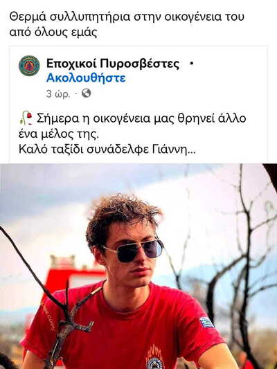 Η Ένωση Πυροσβεστών Κορινθίας αποχαιρετά τον 22χρονο Γιάννη μέσα απο τη σελίδα της στο Facebook