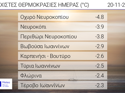 Στον πίνακα που ακολουθεί παρουσιάζονται οι 8 μετεωρολογικοί σταθμοί (εκτός χιονοδρομικών κέντρων) του δικτύου αυτόματων μετεωρολογικών σταθμών του Εθνικού Αστεροσκοπείου Αθηνών / meteo.gr που κατέγραψαν τις χαμηλότερες θερμοκρασίες το πρωί της Δευτέρας 20/11.