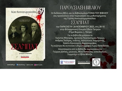 Η παρουσίαση του νέου της βιβλίου με τίτλο «Σσαμπάτ» που κυκλοφορεί από τις εκδόσεις BELL και μας «ταξιδεύει» στα Γιάννενα θα γίνει την Παρασκευή 24 Νοεμβρίου στις 20:15, στη Φιλαρμονική Εταιρία Ωδείο Πατρών (Ρήγα Φεραίου 7, Πάτρα).