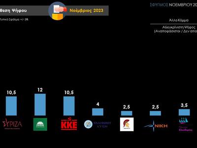 Πιο αναλυτικά, στον δείκτη μέτρησης της πρόθεσης ψήφου (χωρίς άκυρο-λευκό και αποχή) η εκλογική επιρροή της ΝΔ ανιχνεύεται στο 34%, του ΠΑΣΟΚ στο 12%, του ΣΥΡΙΖΑ-ΠΣ και του ΚΚΕ στο 10,5%, της Ελληνικής Λύσης στο 4%, της Πλεύσης Ελευθερίας στο 3,5%, της Νίκης και των Σπαρτιατών στο 2,5%, του ΜεΡΑ25 στο 2%, ενώ το ποσοστό όσων δηλώνουν αναποφάσιστοι ανέρχεται στο 15,5%.