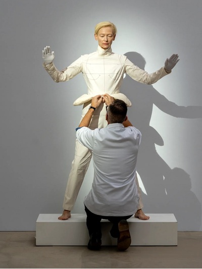 Πρόκειται για την πέμπτη συνάντησή της με τον αναγνωρισμένο ιστορικό μόδας Ολιβιέ Σαγιάρ. Η πρώτη τους σύμπραξη έγινε το 2012 στο Μουσείο της Μόδας του Παρισιού, Palais Galliera, όπου η Τίλντα δοκίμασε από βικτωριανές τουαλέτες και ναπολεόντειες στρατιωτικές στολές μέχρι κομμάτια από τους οίκους Chanel, Schiaparelli και Balenciaga. Ακολούθησαν τα θεάματα «Eternity Dress» (2013), «Cloakroom – Vestiaire obligatoire» (2014), «Sur-exposition» (2016) και τώρα παρουσιάζεται το «Embodying Pasolini» που υλοποιήθηκε πέρυσι. Σαν σιωπηλή κούκλα βιτρίνας, φοράει διαδοχικά κοστούμια από τις ταινίες του αιρετικού, δολοφονημένου Ιταλού κινηματογραφιστή και ποιητή Πιερ Πάολο Παζολίνι. Αιχμαλωτισμένη στο ύφασμα, δεν αναφέρεται όμως στους ρόλους των ηθοποιών που τα πρωτοφόρεσαν.