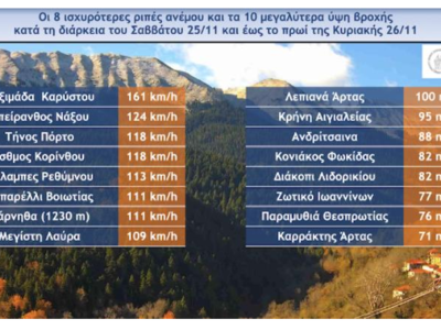 Συνέπεια της κίνησης αυτού του βαθέως βαρομετρικού χαμηλού ήταν η επικράτηση θυελλωδών ανέμων σε αρκετές περιοχές της χώρας μας όπου τοπικά οι ριπές ξεπέρασαν τα 160 km/h, καθώς και σημαντικές βροχοπτώσεις κυρίως στα δυτικά. Στην παρακάτω εικόνα συνοψίζονται οι 8 υψηλότερες ριπές ανέμου και τα 8 μεγαλύτερα ύψη βροχής κατά τη διάρκεια του Σαββάτου 25/11 και έως το πρωί της Κυριακής 26/11.