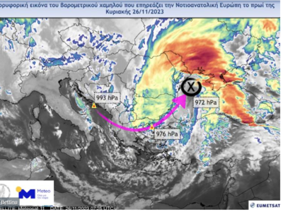 Κατά την πορεία του από τη Νότια Αδριατική Θάλασσα, όπου βρισκόταν τις πρώτες πρωινές ώρες του Σαββάτου 25/11 με εκτιμώμενη ελάχιστη ατμοσφαιρική πίεση στο κέντρο του τα 993 hPa, το βαρομετρικό χαμηλό βάθυνε σημαντικά κινούμενο προς το Βόρειο Αιγαίο.