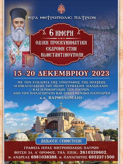 Αξίζει να θυμίσουμε πως το χρονικό διάστημα 15 με 20 Δεκεμβρίου 2023 η Ιερά Μητρόπολη Πατρών με επικεφαλής τον σεβασμιότατο Μητροπολίτη Πατρών κ. Χρυσόστομο θα πραγματοποιήσει 6ήμερη προσκυνηματική εκδρομή στην Κωνσταντινούπολη με την ευκαιρία κιόλας της επίσημης υπογραφής στις 18/12 της Πράξεως αγιοκατατάξεως του Αγίου Γερβασίου Παρασκευόπουλου, διδασκάλου και ιεροκήρυκα των Πατρών, από τον Παναγιότατο Οικουμενικό Πατριάρχη κ.κ. Βαρθολομαίο.