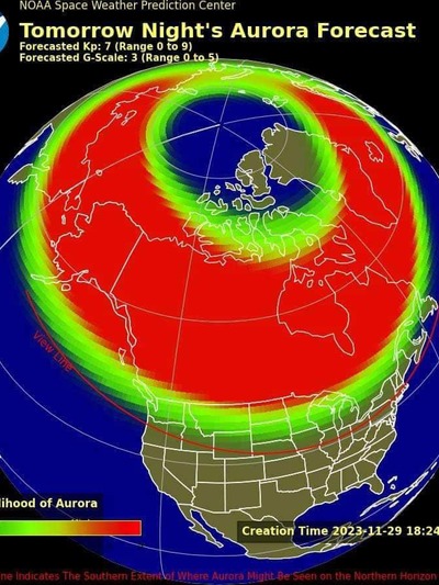 Όπως αναφέρει το Forecast Weather Greece, «σύμφωνα με το NOAA, μία μαζική εκτίναξη ηλιακού πλάσματος που συνέβη στις 28 Νοεμβρίου στην επιφάνεια του Ήλιου, αναμένεται να επηρεάσει την Γη την 1η Δεκεμβρίου, με αποτέλεσμα να αυξάνονται οι πιθανότητες να σημειωθεί μία ισχυρή γεωμαγνητική καταιγίδα κατηγορίας G3, η οποία ενδέχεται να κάνει το Βόρειο Σέλας να γίνει ορατό σε ολόκληρη την Ευρώπη, όπως και σε μεγάλο μέρος των Ηνωμένων Πολιτειών».