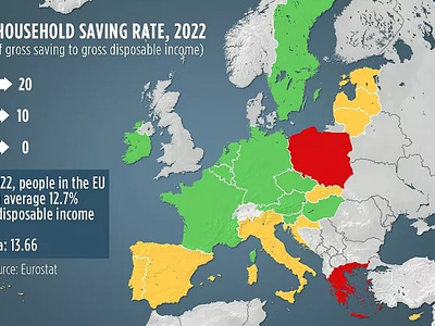Το 2022, οι πολίτες στην ΕΕ αποταμίευαν κατά μέσο όρο το 12,7% του διαθέσιμου εισοδήματός τους. Το ποσοστό αυτό ήταν σημαντικά χαμηλότερο από ό,τι το 2021 (16,4%), ενδεικτικό της γενικότερης ένδειας που χτυπάει την Ευρώπη.