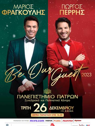 Οι ερμηνευτές Μάριος Φραγκούλης και Γιώργος Περρής με τις εξαιρετικές φωνές θα είναι στην Πάτρα τη δεύτερη μέρα των Χριστουγέννων, την Τρίτη 26 Δεκεμβρίου 2023 για μία μεγάλη, εορταστική συναυλία στο Συνεδριακό και Πολιτιστικό Κέντρο του Πανεπιστημίου Πατρών στο Ρίο.