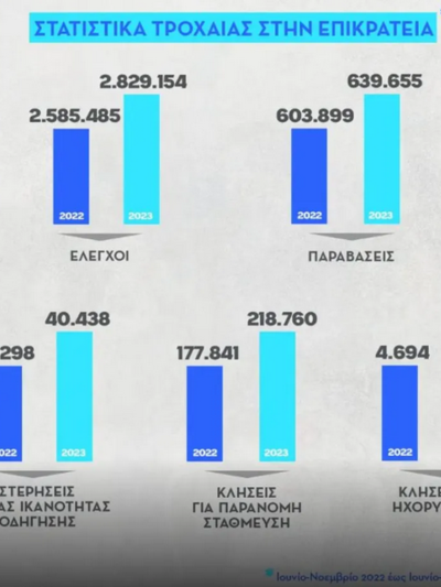 Μάλιστα, στο διάστημα Ιουνίου-Νοεμβρίου 2023 έγιναν 2.829.154 έλεγχοι της Τροχαίας και βεβαιώθηκαν 639.655 παραβάσεις στην Επικράτεια (2.585.485 έλεγχοι στο αντίστοιχο διάστημα το 2022). Παράλληλα, η ΕΛΑΣ προέβη σε 40.438 στερήσεις ικανότητας άδειας οδηγού (34.298 στο αντίστοιχο διάστημα το 2022).