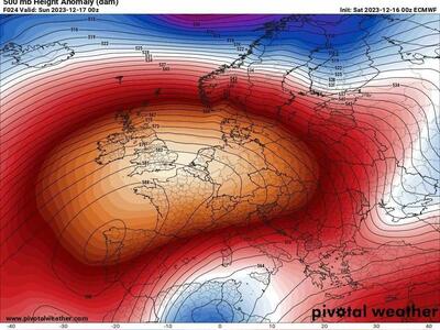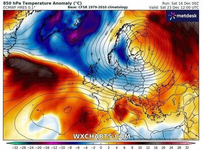 Ο ισχυρός αντικυκλώνας που ήδη επηρεάζει την Δυτική Ευρώπη από το Σαββατοκύριακο,αναμένεται να επεκταθεί σταδιακά στην Κεντρική Ευρώπη, καταλήγοντας λίγο πριν από τα Χριστούγεννα και στην Νοτιοανατολική Ευρώπη, με τις θερμοκρασίες στην ισοβαρική επιφάνεια των 850hPa (περίπου 1200 μέτρα πάνω από την επιφάνεια της θάλασσας), να κινούνται 12 έως 14 βαθμούς πάνω από τον μεσοπρόθεσμο μέσο όρο.