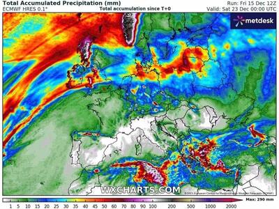 Πάντως, παρά το γεγονός ότι θα επικρατήσουν ξηρές συνθήκες στο μεγαλύτερο μέρος της Ευρώπης έως και την ημέρα των Χριστουγέννων, ίσως να έχουμε την εκδήλωση κάποιων βροχοπτώσεων, τουλάχιστον στο Ηνωμένο Βασίλειο, στα δυτικά τμήματα της Σκανδιναβίας, όπως επίσης στην νότια και την νοτιοανατολική Ευρώπη, όπου θα σημειωθούν κατά πάσα πιθανότητα και τα πιο αξιόλογα φαινόμενα.