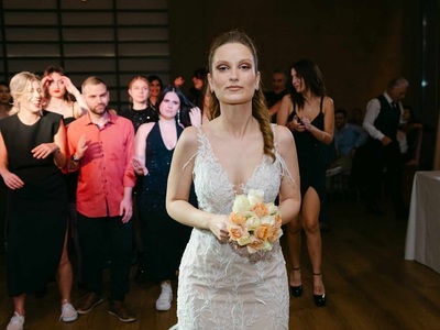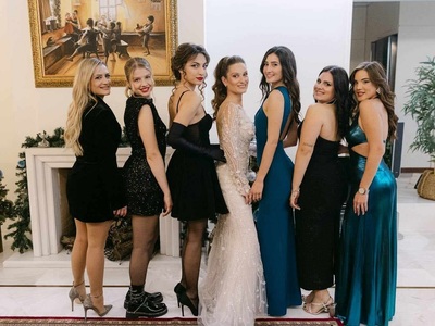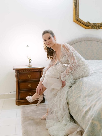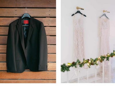 Ο γαμπρός επέλεξε κοστούμι Boss από το κατάστημα TheMark Κωνσταντινίδης και προετοιμάστηκε μαζί με την αδελφή του Βικτώρια, ενώ η νύφη, ως bridal expert άλλαξε δυο νυφικά περιστοιχισμένη από τις φίλες της: Στο γαμήλιο μυστήριο φόρεσε glam δημιουργία Demetrios Platinum με ολοκέντητη διαφάνεια, μακριά μανίκια και πέπλο, ενώ στο party που ακολούθησε ένα έξωμο νυφικό Justin Alexander με άνθινο στολισμό πάνω σε τούλι και στενή, θηλυκή γοργονέ σιλουέτα. Και τα δυο outfits βασίζονταν στη ρομαντική εκδοχή του nude dress, που αποτελεί κυρίαρχο luxury trend διεθνώς και προέρχονταν βέβαια από το Ck store. Tα πέδιλα ήταν σε δικό της design, το χτένισμά της επιμελήθηκε το Koralia Hair & Beauty και το μακιγιάζ έκανε η Βασιλική Ζορμπά.