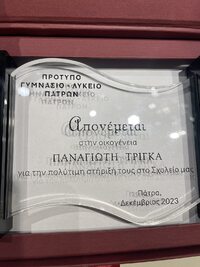 Η διαφορετική νότα στην ζεστή ατμόσφαιρα της βραδιάς, δόθηκε με την βράβευση του κυρίου Παναγιώτη Τρίγκα για την μεγάλη του προσφορά, σε υλικό και τεχνικό εξοπλισμό, δίνοντας την δυνατότητα στους μαθητές και τους εκπαιδευτικούς να αξιοποιήσουν στο έπακρο τις δεξιότητές τους.