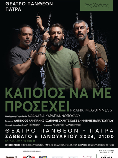Η παράσταση “Κάποιος να με προσέχει” (Someone who’ll watch over me) του Frank McGuinness σε μετάφραση/σκηνοθεσία της Αθανασίας Καραγιαννοπούλου αναμένεται να παιχθεί στην Πάτρα, στη σκηνή του θεάτρου Πάνθεον το Σάββατο 6 Ιανουαρίου 2024 στις 21.00