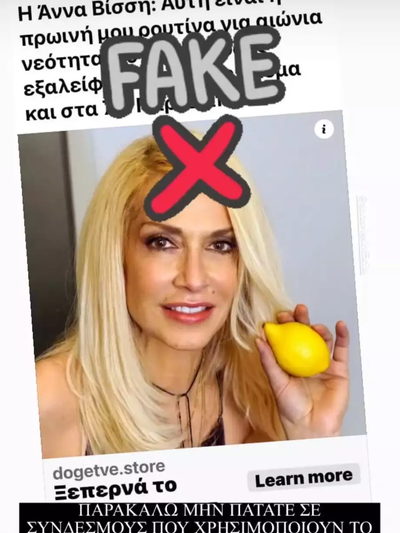 Το απόγευμα της Πέμπτης (28.12.2023) η Άννα Βίσση ανέβασε stories στο instagram και ενημέρωσε τους θαυμαστές της ότι διαφημίσεις που κυκλοφορούν με το πρόσωπό της, δεν είναι αληθινές!