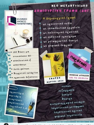 Το νέο ΠΜΣ «Δημιουργική Γραφή» (ΔΗΓ) του Ελληνικού Ανοικτού Πανεπιστημίου δέχεται αιτήσεις φοιτητών για το εαρινό εξάμηνο 2024.