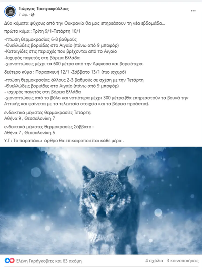 Σύμφωνα με τον Διευθυντή της ΕΜΥ Θεόδωρο Κολυδά το διήμερο Τρίτης-Τετάρτης οι θερμοκρασίες θα είναι λίγο κάτω από τα κανονικά επίπεδα με θυελλώδεις βοριάδες. Χιονοπτώσεις και σε ημιορεινές περιοχές αλλά την Τετάρτη εξασθένηση. Την Παρασκευή και το Σάββατο θα εκδηλωθούν πολλές βροχές και η Κρήτη, μετά από μακρύ χρονικό διάστημα.
