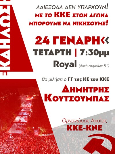 Οι Οργανώσεις Αχαΐας του ΚΚΕ και της ΚΝΕ διοργανώνουν εκδήλωση την Τετάρτη στις 7:30μμ στο Royal (Ακτή Δυμαίων 51) με θέμα: «ΑΔΙΕΞΟΔΑ ΔΕΝ ΥΠΑΡΧΟΥΝ! ΜΕ ΤΟ ΚΚΕ ΣΤΟΝ ΑΓΩΝΑ ΜΠΟΡΟΥΜΕ ΝΑ ΝΙΚΗΣΟΥΜΕ!».