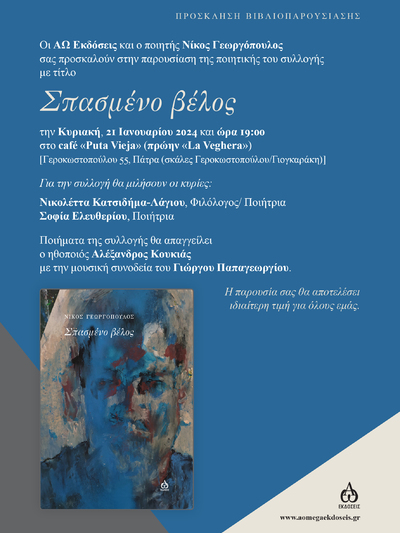 Οι ΑΩ εκδόσεις και ο ποιητής Νίκος Γεωργόπουλος προσκαλούν το κοινό στην εκδήλωση παρουσίαση της ποιητικής συλλογής του Νίκου Γεωργόπουλου με τίτλο «Σπασμένο Βέλος» που θα γίνει την Κυριακή 21 Ιανουαρίου 2024 και ώρα 19:00 στο καφέ "Puta Vieja (πρώην "La Vengera") στην Γεροκωστοπούλου 55 (σκάλες Γεροκωστοπούλου/πρώην Γιογκαράκη) στην Πάτρα.
