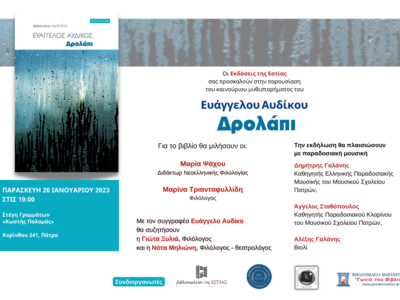 Το μυθιστόρημα του Ηπειρώτη στην καταγωγή συγγραφέα Ευάγγελου Αυδίκου με τίτλο «Δρολάπι» που έχει κυκλοφορήσει από τις εκδόσεις της Εστίας, θα παρουσιαστεί σε εκδήλωση που διοργανώνει τι βιβλιοπωλείο Η Γωνιά του βιβλίου της οικογένειας Παπαχρίστου, με τον Σύνδεσμo Φιλολόγων Πάτρας και τον Πανηπειρωτικό Σύλλογο Πάτρας.