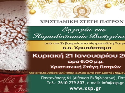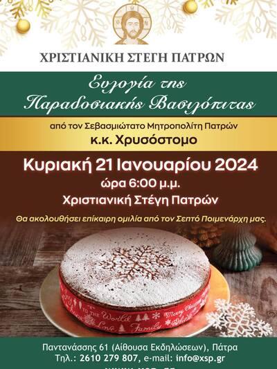 Εκδήλωση όπου θα ευλογηθεί η παραδοσιακή Βασιλόπιτα για το νέο έτος 2024 θα λάβει χώρα στη Χριστιανική Στέγη Πατρών, στην οδό Παντανάσσης 61 όπου έχει προσκληθεί και θα παραστεί ο σεβασμιότατος Μητροπολίτης Πατρών κ.κ. Χρυσόστομος.