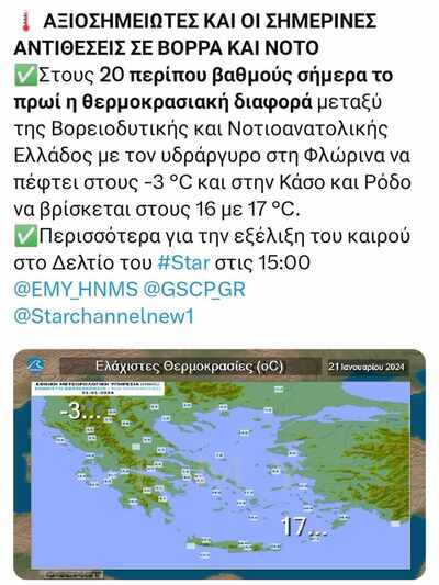 Σύμφωνα με ανάρτηση του Θοδωρή Κολυδά για τον καιρό, η διαφορά στη θερμοκρασία έφτασε στους 20 βαθμούς Κελσίου μεταξύ της Βορειοδυτικής και Νοτιοανατολικής Ελλάδος, καθώς ο υδράργυρος στη Φλώρινα έπεσε στους -3 °C και στην Κάσο και Ρόδο να βρίσκεται στους 16 με 17 °C.