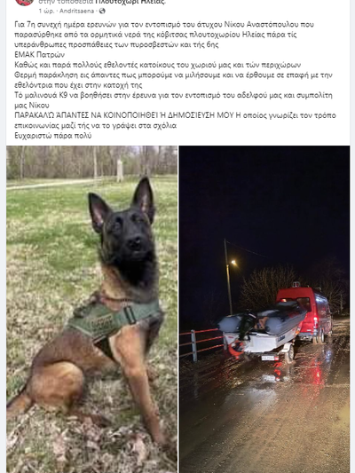 Τό μαλινουά Κ9 να βοηθήσει στην έρευνα για τον εντοπισμό του αδελφού μας και συμπολίτη μας Νίκου