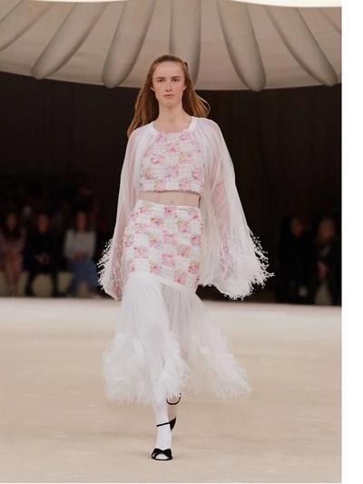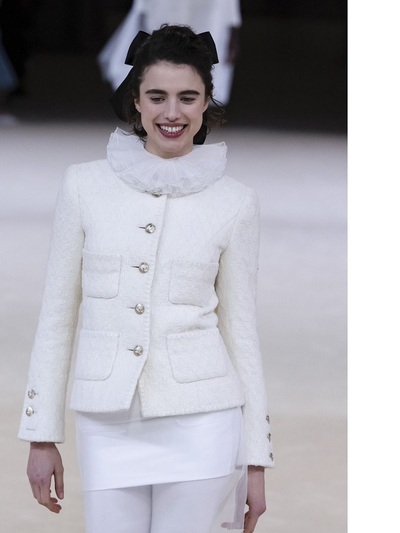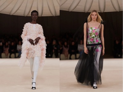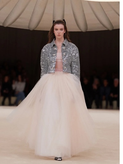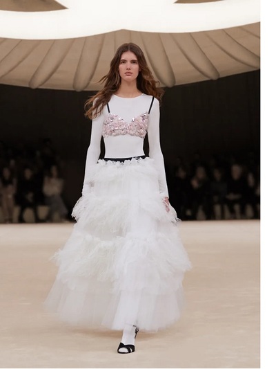 Στην πασαρέλα της Chanel ξεχώρισε η παρουσία της ambassador του οίκου Μάργκαρετ Κουάλει, μιας ταχύτατα ανερχόμενης ηθοποιού που παίζει στο «Poor Things» του Γιώργου Λάνθιμου ενώ τα ρούχα ήταν εμπνευσμένα από το βεστιάριο χορού και μπαλέτου με το τούλι να επικρατεί. Στον Giambattista Valli που ειδικεύεται στα νεοραμαντικά φρου- φρου με εκτόπισμα χειροκροτήθηκε ένας συνδυασμός στοιχείων εποχής με τα "μπαλούν των eighties. Στα μαλλιά οι φιόγκοι ήταν απαραίτητοι.