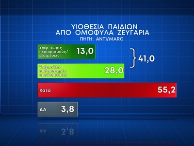 Για την υιοθεσία παιδιών από ομόφυλα ζευγάρια το 13% δηλώνει υπέρ χωρίς περιορισμούς, το 28% δηλώνει υπέρ αλλά με προϋποθέσεις ενώ το 55,2% δηλώνει κατά.
