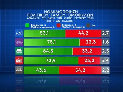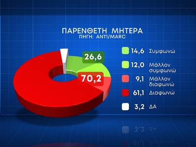 Η ελληνική κοινωνία είναι υπέρ του πολιτικού γάμου για τα ομόφυλα ζευγάρια αλλά αντίθετη με την υιοθεσία παιδιών καθώς και με την απόκτησή του μέσω παρένθετης μητέρας, σύμφωνα με τη δημοσκόπηση της Marc.