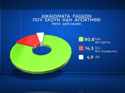 Αντίθετα στα δικαιώματα των παιδιών που έχουν ήδη αποκτηθεί από ομόφυλα ζευγάρια το 80,8% λέει πως ναι θα πρέπει και μόλις το 14,3% όχι, δεν συμφωνώ.