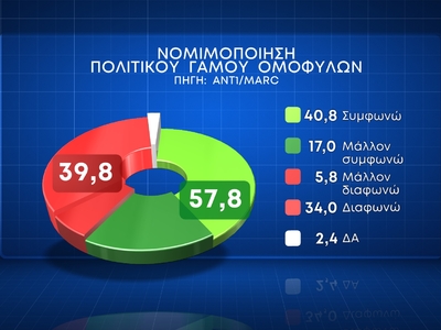 Στη δημοσκόπηση της Marc που παρουσιάστηκε στο κεντρικό δελτίο ειδήσεων του ΑΝΤ1 και στο ερώτημα για τον πολιτικό γάμο ανάμεσα στα ομόφυλα ζευγάρια το 40,8% απάντηση συμφωνώ και το 17% μάλλον συμφωνώ, ενώ διαφωνώ λέει το 34% και μάλλον διαφωνώ το 5,8%.