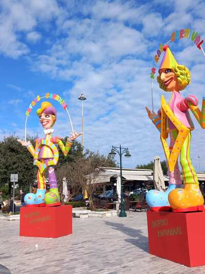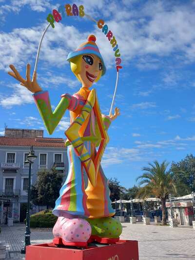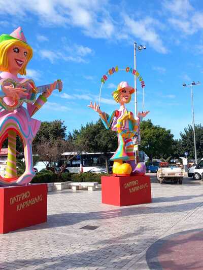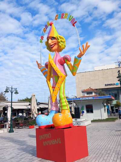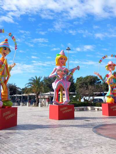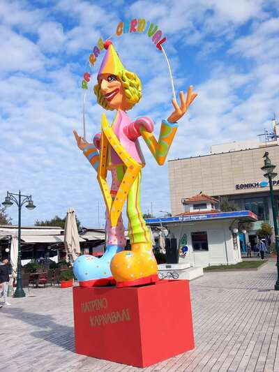 Πρόκειται για 5 νέα καρναβαλικά στοιχεία-πολύχρωμες φιγούρες, εκ των οποίων η μία παριστάνει μια γυναίκα που παίζει κιθάρα και οι τέσσερις υπόλοιπες είναι κλόουν που στα χέρια τους «κρατούν καλά» το Πατρινό Καρναβάλι («Patras Carnival») στήνοντας όλες μαζί έναν χορό εξωστρέφειας, χαράς, λάμψης, χρώματος, κίνησης και αισιοδοξίας. Οι λουσμένες στο φως φιγούρες βασίστηκαν στα σχέδια του Πατρινού εικαστικού καλλιτέχνη και τεχνίτη Γιώργου Καράβολα, γνώστη της τεχνοτροπίας του Καρναβαλικού Εργαστηρίου, που παραχωρήθηκαν δωρεάν στην ΚΕΔΗΠ-Καρναβάλι Πάτρας. Τα σχέδια πήραν μορφή από τον Δημήτρη Ντζουμάνη και επιζωγραφήθηκαν από τον Γιώργο Μπαμπίλη του Καρναβαλικού Εργαστηρίου του Δήμου Πατρέων.