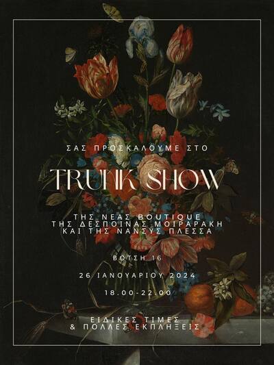 Απόψε, Παρασκευή 26 Ιανουαρίου, η νέα μπουτίκ της Δέσποινας Μοιραράκη και της Νάνσυς Πλέσσα, πραγματοποιεί ένα Trunk Show όπου θα παρουσιαστεί η χειμερινή κολεξιόν, σε μια βραδιά με πολλές εκπλήξεις και ειδικές τιμές σε ό,τι επιλέξετε να αγοράσετε.