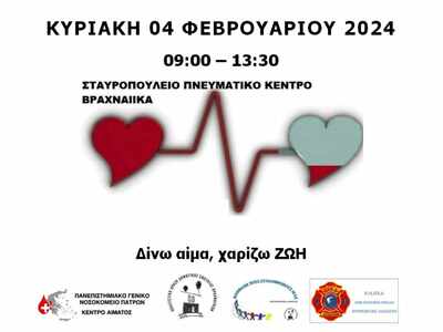 Εθελοντική αιμοδοσία πραγματοποιείται την Κυριακή 4 Φεβρουαρίου 2024 στο Σταυροπούλειο πνευματικό κέντρο στα Βραχνέικα Πατρών.
