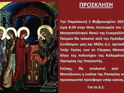 Στην Πάτρα το πρωί της Παρασκευής στον ιερό Μητροπολιτικό ναό Ευαγγελιστρίας στη διάρκεια της Θείας λειτουργίας στις 8.30 π.μ. θα πραγματοποιηθεί αρτοκλασία υπέρ υγείας και προκοπής των μελών των εν Πάτραις Μεσσηνίων. Το κάλεσμα για την τέλεση της αρτοκλασίας γίνεται από την πρόεδρο του Δ.Σ. του Παμμεσσηνιακού Συνδέσμου «Ο Παπαφλέσσας», Πηνελόπη Ν. Λαμπούση λόγω της Πολιούχου της Καλαμάτας Παναγίας της Υπαπαντής.