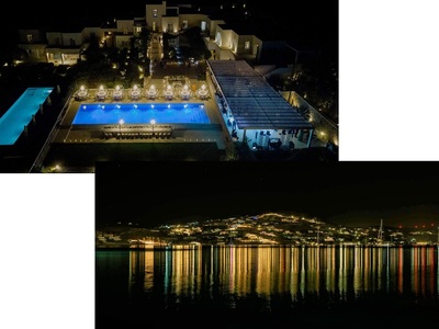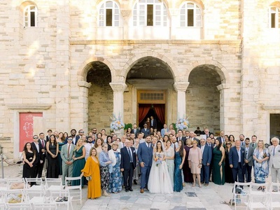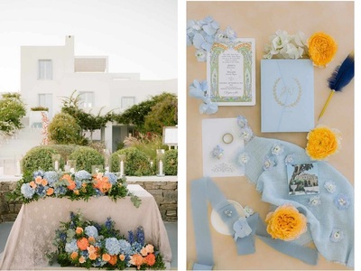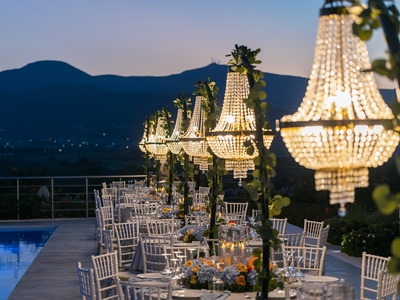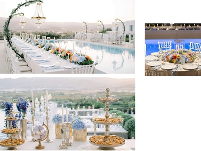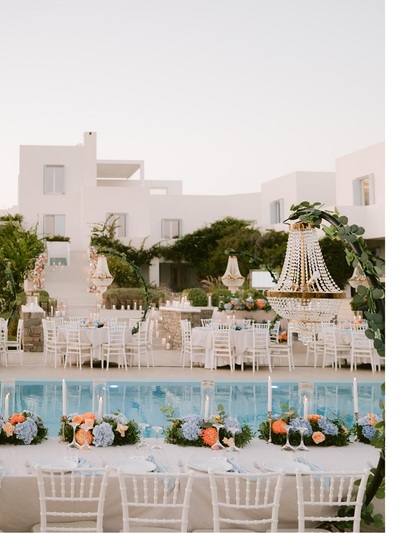 Στον υπαίθριο χώρο γύρω από τη μεγάλη πισίνα και με την απερίγραπτη θέα, ο κόσμος δείπνησε και διασκέδασε σε ένα ονειρικό περιβάλλον. Τα τραπέζια ήταν στολισμένα με αζούρ ορτανσίες και κοραλλί λουλούδια, με κρυστάλλινους πολυέλαιους από πάνω. Η Αννα Μαρία Ρογδάκη είχε επιμεληθεί και διάφορες πρόσθετες γωνιές στην ίδια παστέλ, άνθινη διχρωμία με κομψή και ρομαντική διάθεση και εκλεπτυσμένα deco objects.