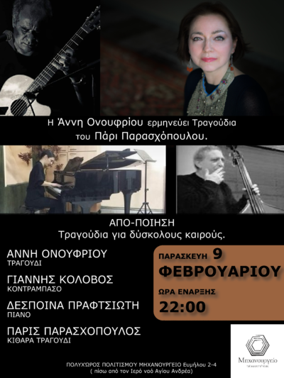 Την Παρασκευή 9 Φεβρουαρίου 2024 στις 22.00 στην Μουσική Σκηνή στο Μηχανουργείον, στην οδό Ευμήλου 2-4, στην Πάτρα η συμπολίτισσα ερμηνεύτρια Άννη Ονουφρίου θα ερμηνεύσει τραγούδια του Πάρι Παρασχόπουλου.