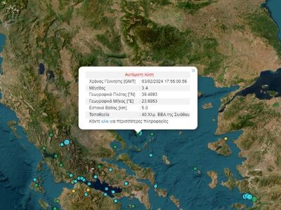 Σεισμική δόνηση 3,4 βαθμών της Κλίμακας Ρίχτερ σημειώθηκε στις 19:56 στον θαλάσσιο χώρο ανοιχτά της Σκιάθου.