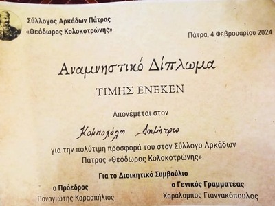Με μεγάλη επιτυχία στην κατάμεστη αίθουσα του Πνευματικού Κέντρου του Αγίου Ανδρέα στις 4 Φεβρουαρίου 2024 κόψαμε την καθιερωμένη Πρωτοχρονιάτικη πίτα του Συλλόγου μας, των Αρκάδων Πάτρας «Θεώδορος Κολοκοτρώνης». Μία ημέρα συμβολική, καθώς σαν τη σημερινή, στις 4 Φεβρουαρίου του 1843 άφησε την τελευταία του πνοή ο Αρχιστράτηγος του Γένους Θεόδωρος Κολοκοτρώνης, του οποίου και το όνομα του φέρει ο Σύλλογός μας. Ιδιαίτερη τιμή για εμένα αποτέλεσε το Αναμνηστικό Δίπλωμα που μου δόθηκε για την προσφορά μου και το έργο μου ως Προέδρου προηγούμενου Διοικητικού Συμβουλίου κατά την τριετία 2018-2021, το οποίο παρέλαβα από τον Σεβασμιώτατο κ.κ. Χρυσόστομο. Ευχαριστώ θερμά τον φίλο και Πρόεδρο Παναγιώτη Καρασπήλιο και τον φίλο και Γραμματέα Χαράλαμπο Γιαννακόπουλο για τον τιμητικό έπαινο, όπως και τα υπόλοιπα μέλη του νέου Δ.Σ. Ο Σύλλογός μας αποτελεί φορέα πολιτισμού, παράδοσης, αξιών, ελληνικότητας. Αυτής της ελληνικότητας, όπως αισθητοποιείται εύγλωττα στην ποιητική συλλογή «Ο Ήλιος ο Ηλιάτορας» του νομπελίστα μας ποιητή Οδυσσέα Ελύτη, ο οποίος στο ποίημα του «Τρελοβάπορο», παραλληλίζει την Ελλάδα με ένα καράβι, που ξεκινά από τις αμμουδιές του Ομήρου και ξεχύνεται ως τις μέρες μας με παραστάτη τον Ήλιο, που συμβολίζει την πνευματική ικανότητα των Ελλήνων, καθώς και τη Θεϊκή βοήθεια. Αυτές τις αξίες υπερασπιζόμαστε και θα συνεχίσουμε με αφοσίωση να υποστηρίζουμε!