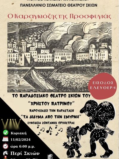 Το Παραδοσιακό Θέατρο Σκιών του συμπολίτη καραγκιοζοπαίκτη Χρήστου Πατρινού σε συνεργασία με το Πανελλήνιο Σωματείο Θεάτρου Σκιών και την στήριξη του Υπουργείου Πολιτισμού & Αθλητισμού παρουσιάζουν αυτή την Κυριακή 11 Φεβρουαρίου 2024 την παράσταση «Ο Καραγκιόζης της Προσφυγιάς. Τα δίδυμα από την Σμύρνη».