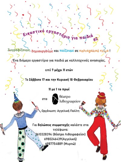 Ένα διήμερο εργαστήριο για παιδιά με καλλιτεχνικές ανησυχίες, από 7 έως 11 ετών (Β’ – Ε’ τάξη Δημοτικού) διοργανώνεται το Σάββατο 17 και την Κυριακή 18 Φεβρουαρίου, από τις 11.00 μέχρι τη 1.00 στο θέατρο Λιθογραφείο, με υπεύθυνη οργάνωσης την Αγγελική Πολίτη.