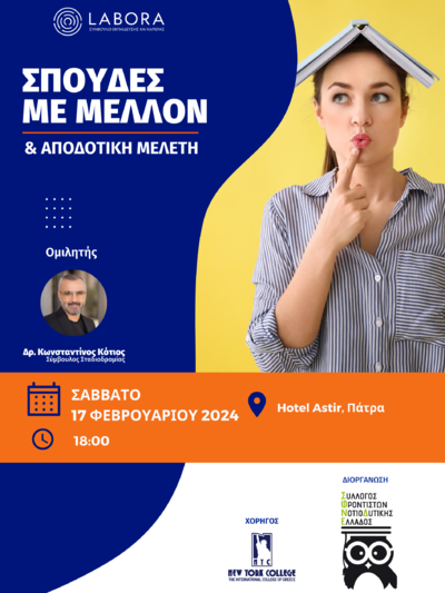 O Σύλλογος Ιδιοκτητών Φροντιστηρίων Νοτιοδυτικής Ελλάδας διοργανώνει στην Πάτρα, ημερίδα με τίτλο «Επαγγέλματα με Μέλλον & Αποδοτική Μελέτη», το Σάββατο 17 Φεβρουαρίου 2024 και ώρα 18:00 στο Ξενοδοχείο Αστήρ, Αίθουσα εκδηλώσεων (ημιώροφος) με προσκεκλημένο τον Δρ. Κωνσταντίνο Κότιο, Σύμβουλο Σταδιοδρομίας της εταιρείας Labora.