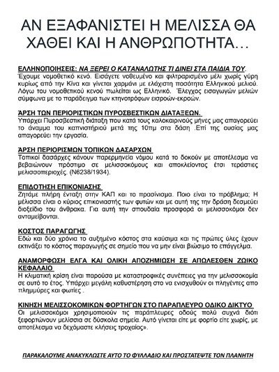 Ζητούν επιδότηση επικονίασης, αναδεικνύουν το θέμα "των ελληνοποιήσεων στο μέλι", καθώς και τα ζητήματα του αυξημένου κόστους των καυσίμων και των πρώτων υλών "που έχουν εκτινάξει το κόστος παραγωγής, σε σημείο που να μην είναι βιώσιμο το επάγγελμα".