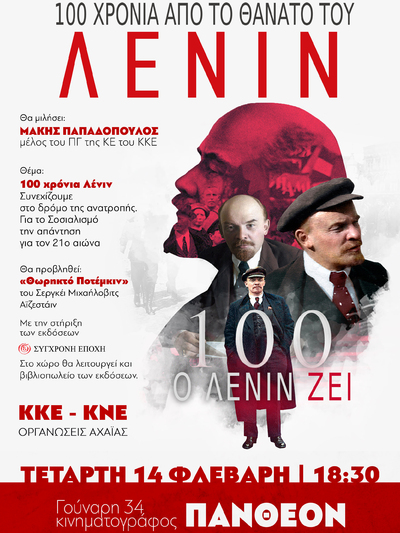 Οι Οργανώσεις Αχαΐας του ΚΚΕ και της ΚΝΕ διοργανώνουν εκδήλωση με θέμα «100 χρόνια Λένιν - Συνεχίζουμε στο δρόμο της ανατροπής. Για το Σοσιαλισμό την απάντηση στον 21ο αιώνα».