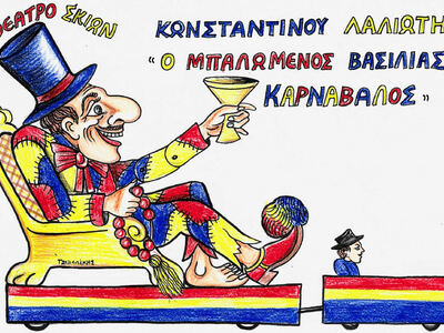 -Παράσταση θεάτρου σκιών «Ο μπαλωμένος βασιλιάς Καρνάβαλος» από τον καραγκιοζοπαίκτη Κωνσταντίνο Λαλιώτη (σενάριο, κείμενα) σε φιγούρες – σκηνικά Νικόλα Τζιβελέκη.