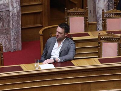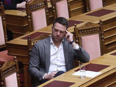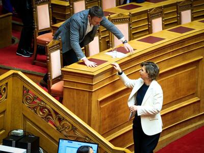 Ο Στέφανος Κασσελάκης είχε μία σύντομη συνομιλία με την Όλγα Γεροβασίλη, πριν η βουλεύτρια ανεβεί στο βήμα για την ομιλία της.